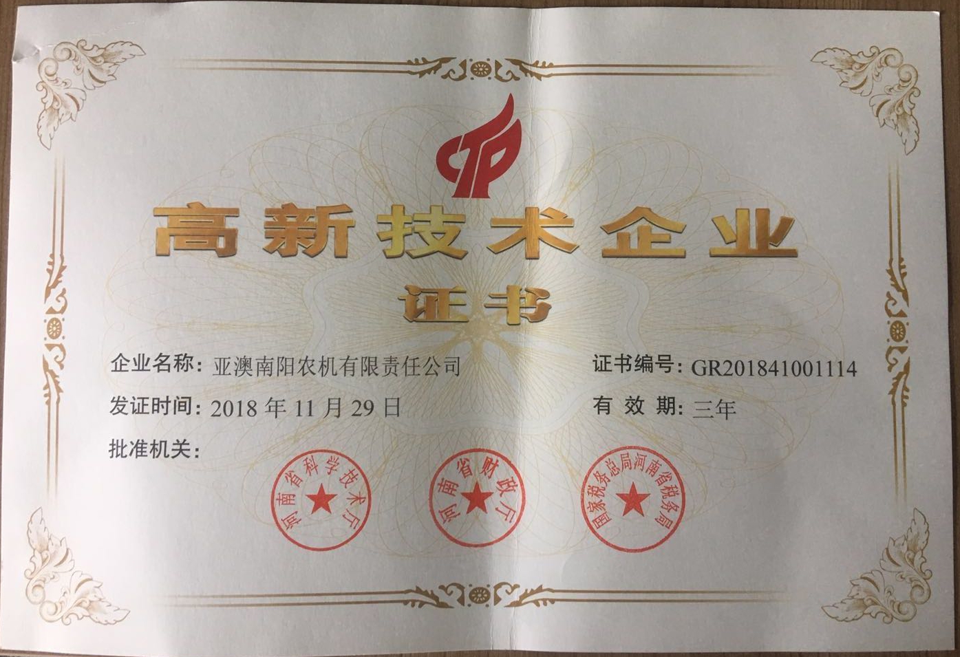 由河南省科學技術(shù)廳、河南省財政廳、國家稅務總局河南省稅務局,聯(lián)合頒發(fā)“高新技術(shù)企業(yè)”認定證書,標志著亞澳農(nóng)機在研發(fā)和創(chuàng)新方面的能力,得到了國家相關(guān)部門的肯定與認可。